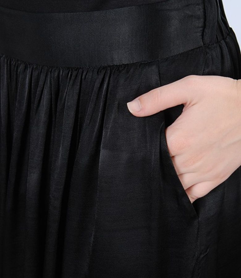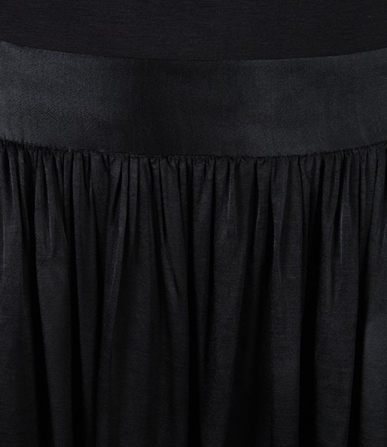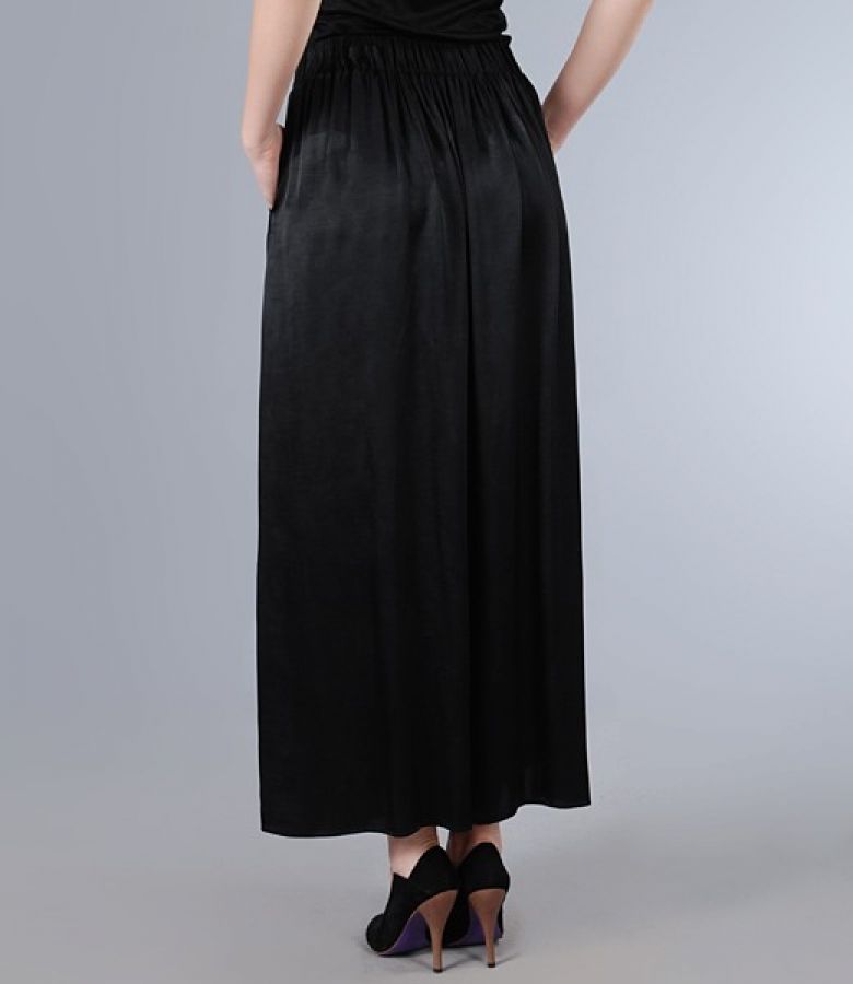 Long skirt, casual, in satin viscose, side false pockets. Straight cord in front, wrinkled and elastic in back. Elastic waist on back.