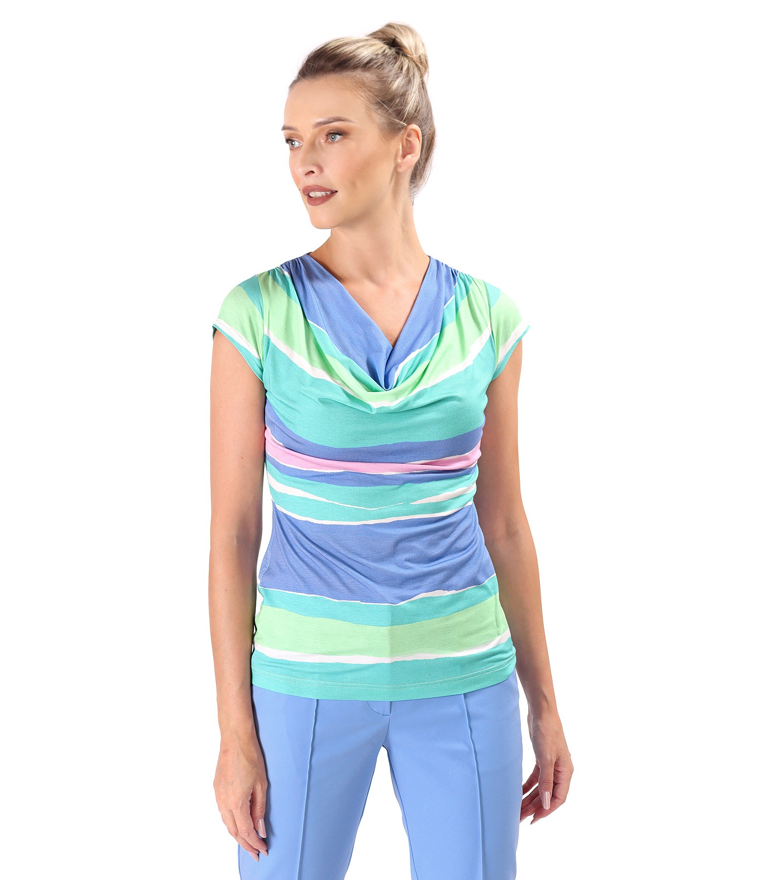Blouse made of elastic jersey printed with stripes, with pleated neckline and wing sleeves.
