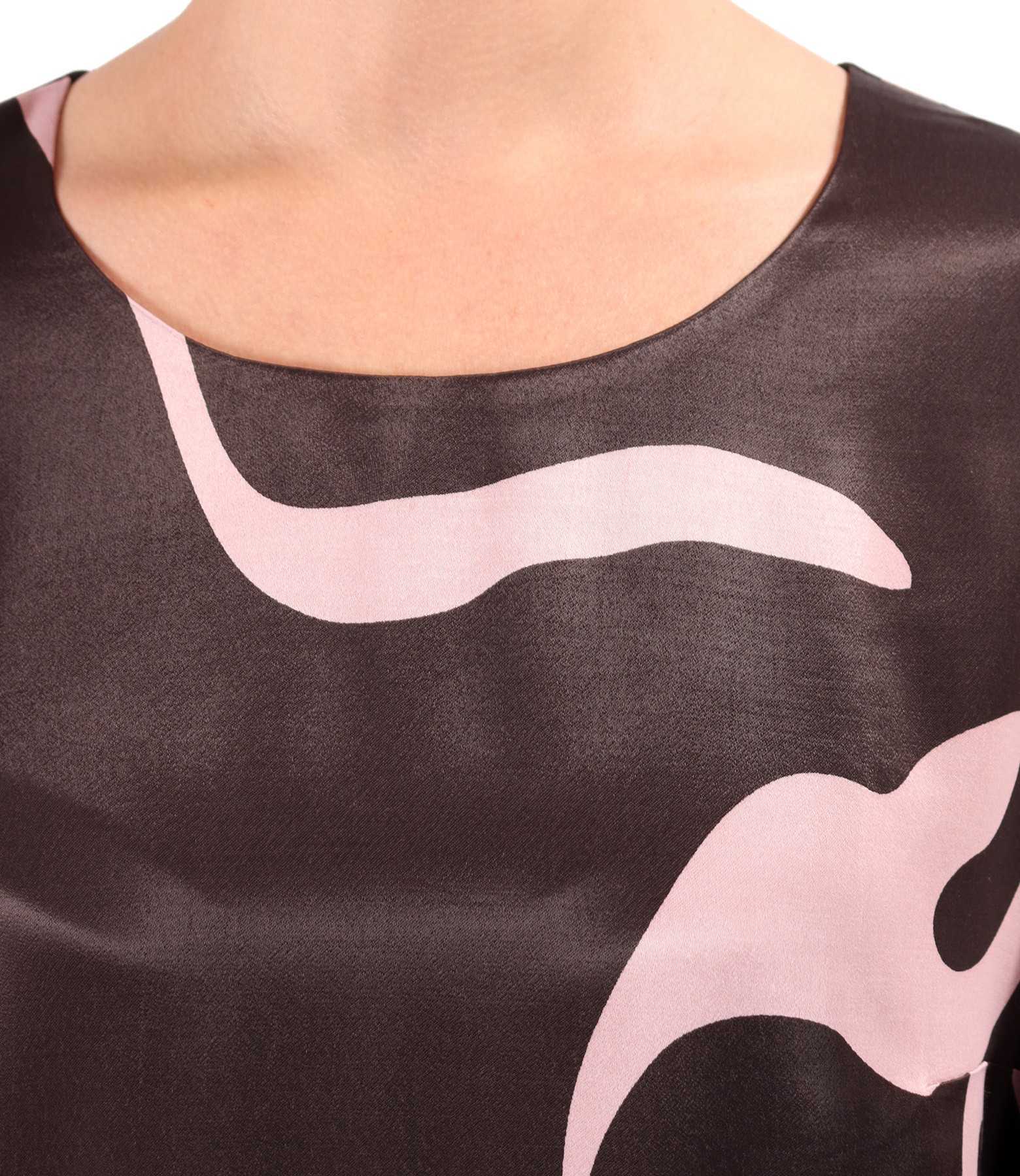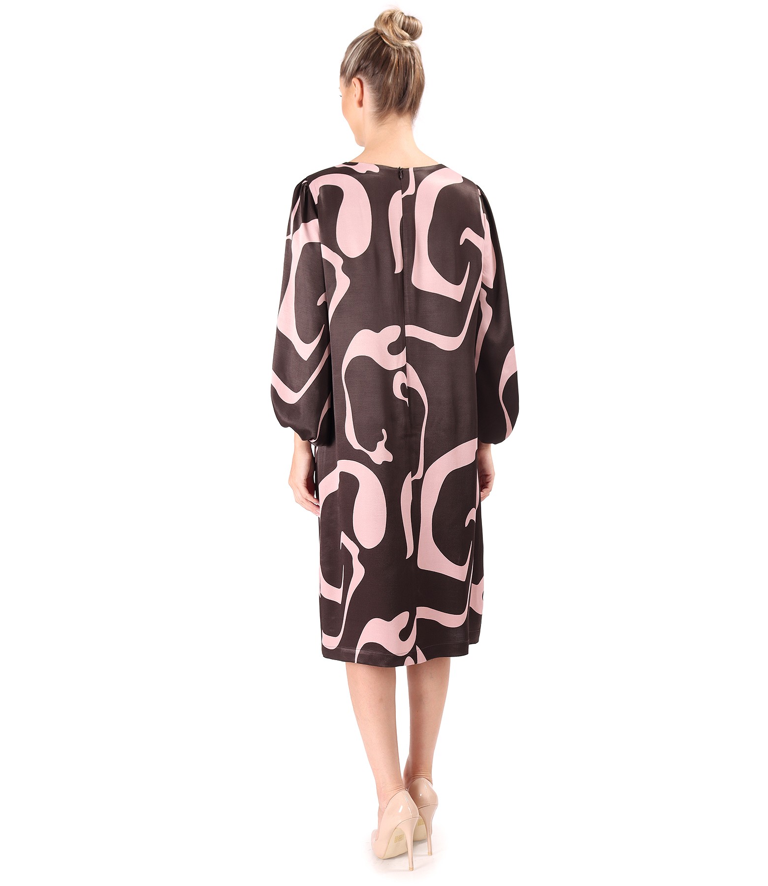 Casual dress made of printed satin viscose, lined with viscose, featuring a round neckline and mid-length sleeves gathered at the cuffs. Fastens with a concealed zipper at the back.