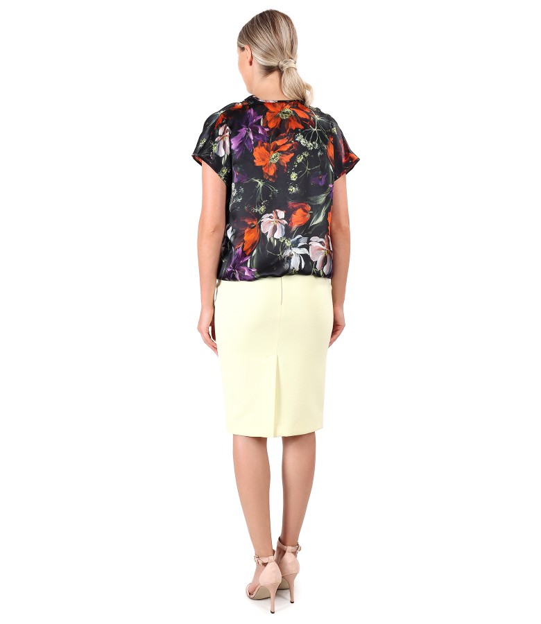 Casual blouse made of natural silk printed with floral motifs, with dropped sleeves, V neckline and elastic at the end.