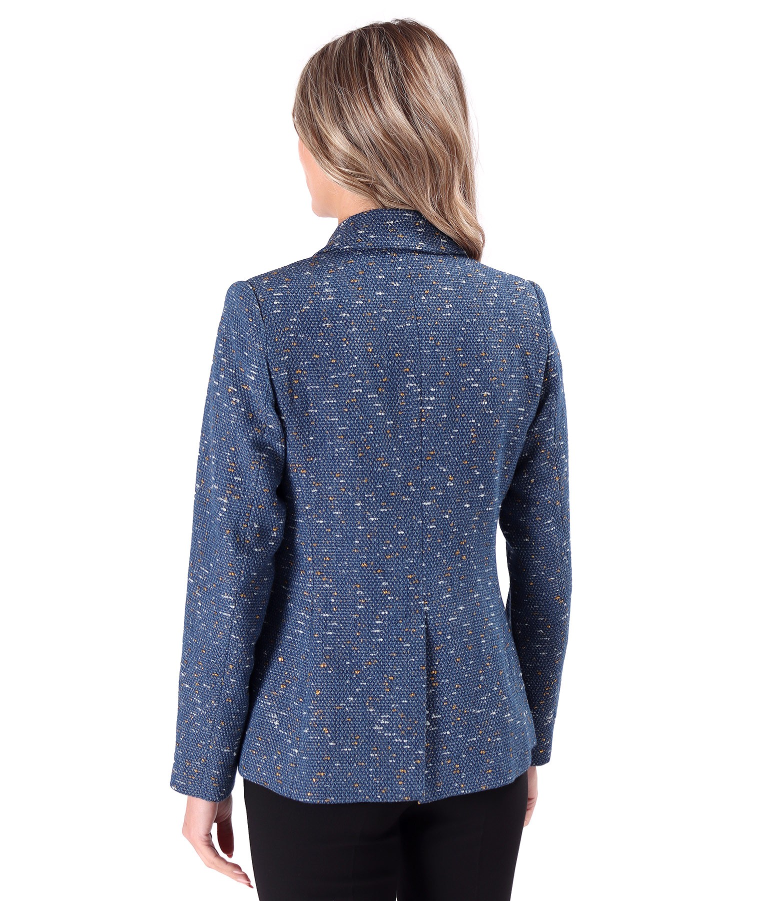 Cotton office jacket, lined, with a deep neckline, patch pockets on the front, and a center-back vent. Fastens with two front buttons.