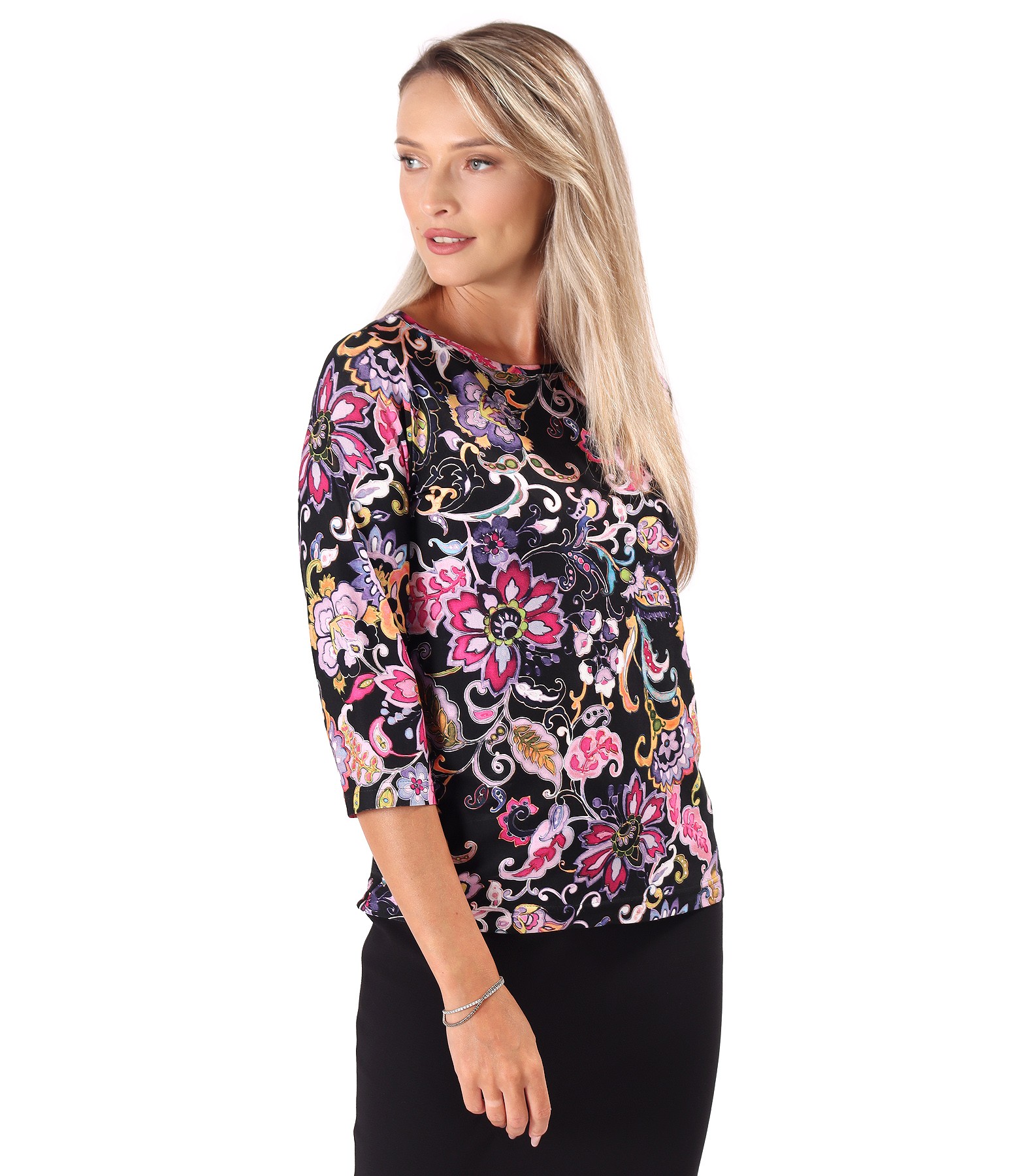 Elastic jersey blouse printed with floral motifs, printed with floral motifs, featuring a round neckline and 3/4 sleeves. The position of the print varies per product.