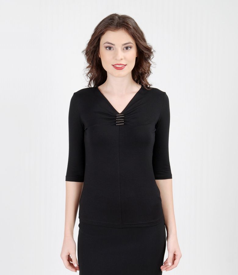 Elastic jersey t-shirt cut on middle front, with V neckline and accessory.