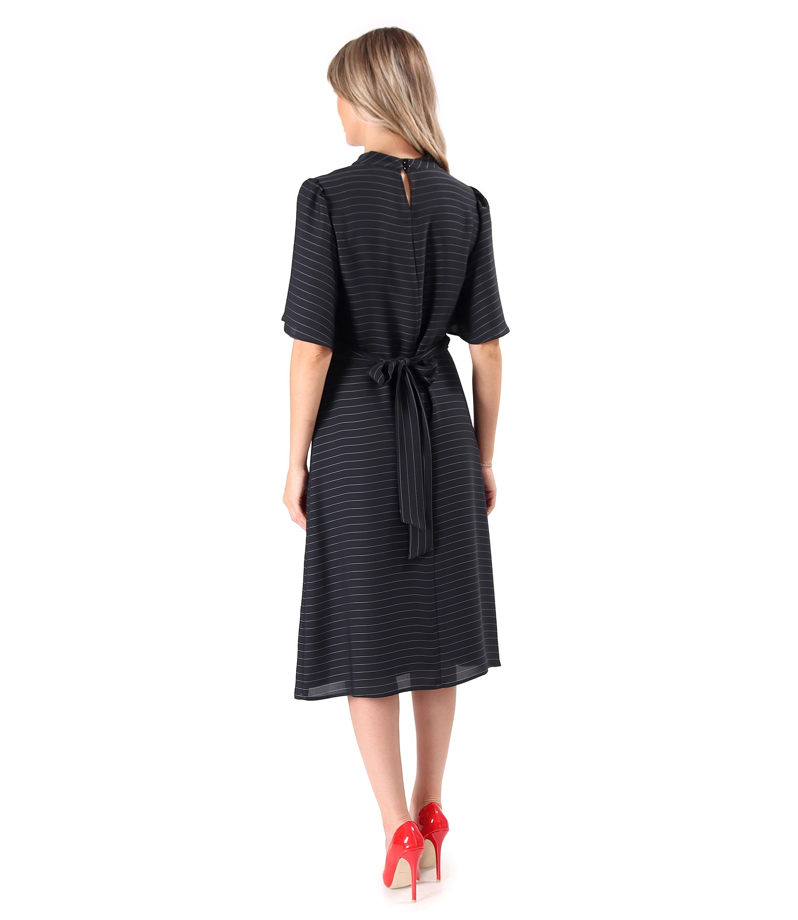 Elegant dress with a twisted cord at the waist, striped print, lined with viscose, and featuring short flared sleeves. Fastens with two buttons at the center back.