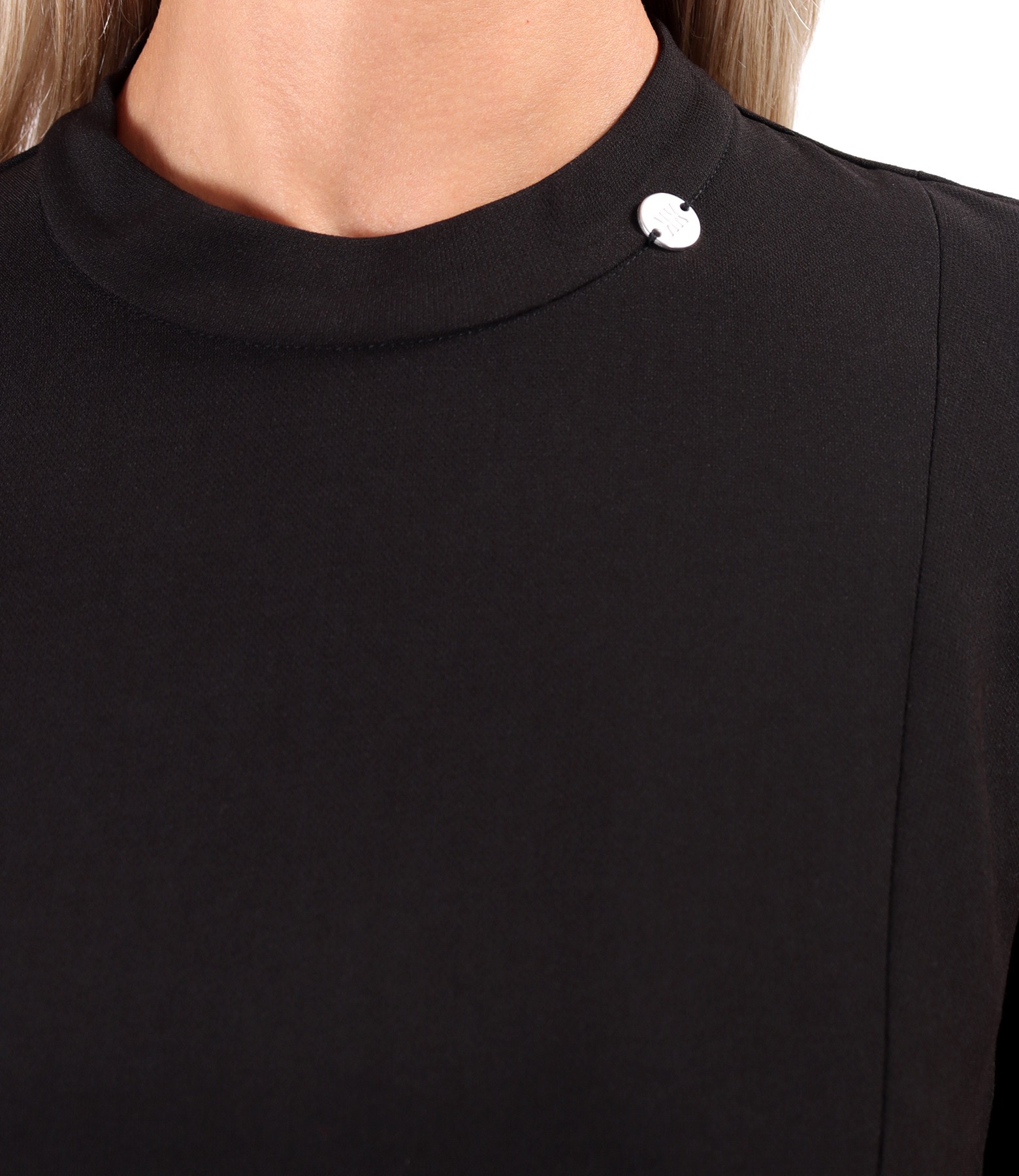 Elegant dress made of elastic fabric with viscose, featuring long flared sleeves and a round neckline. It fastens with a hidden zipper at the center back.