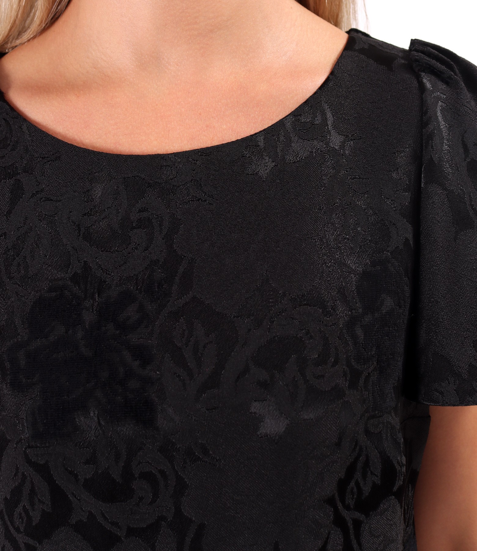 Elegant dress with short, wide sleeves lined with viscose, a round neckline, and a slit on the left side. It fastens with a concealed zipper at the center back.