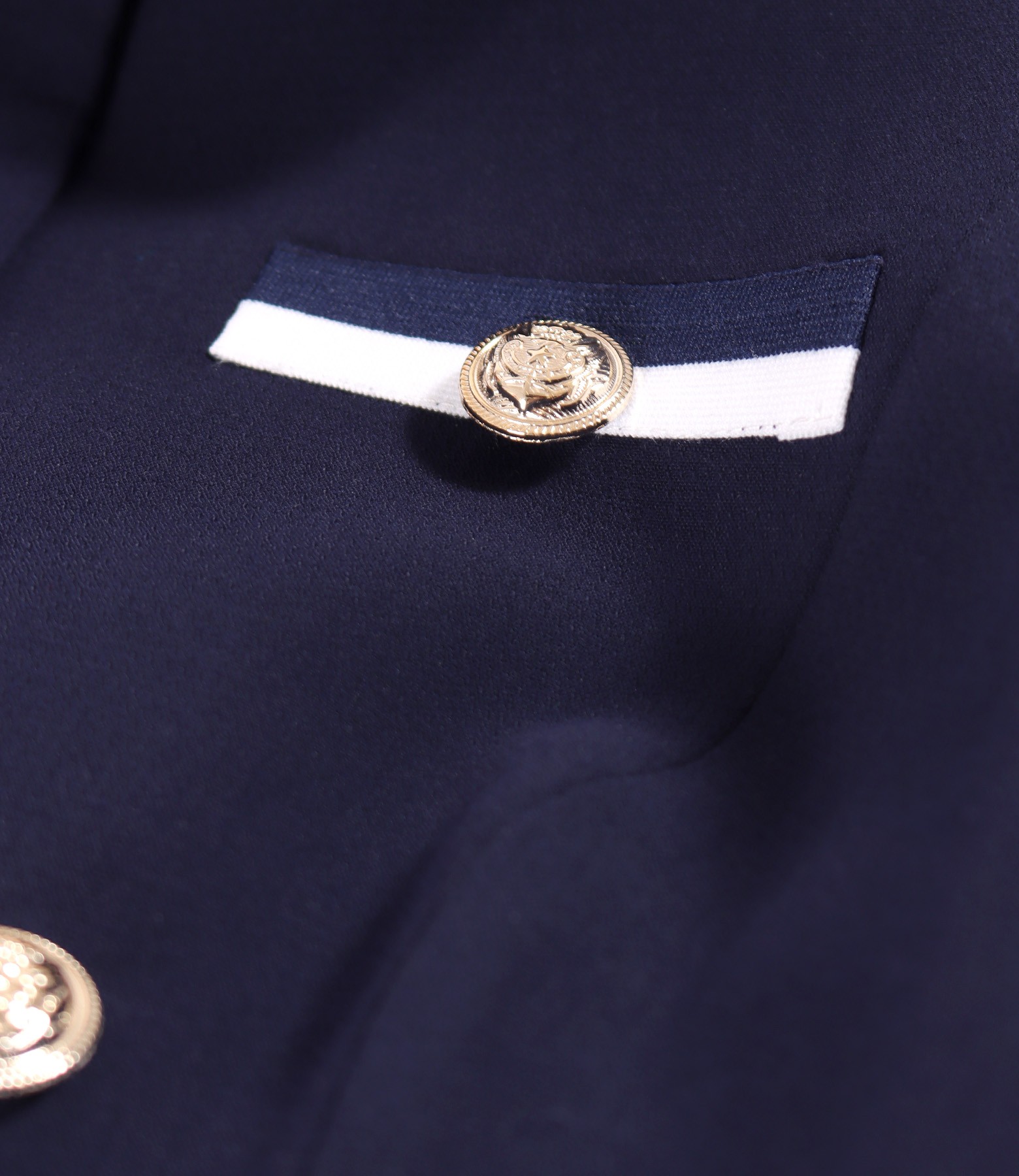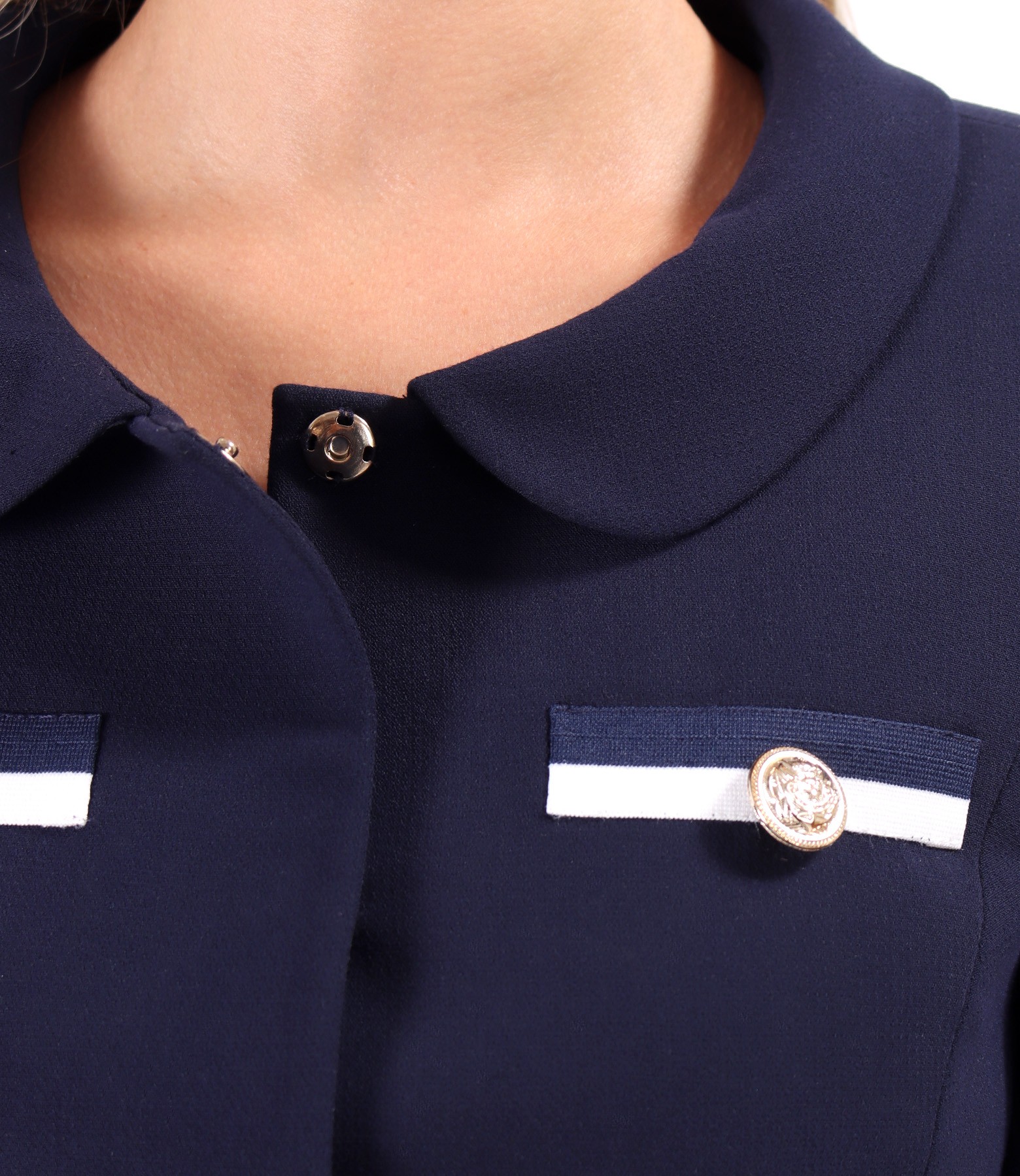 Elegant jacket made of elastic viscose fabric, with decorative buttons, round collar, and semi-long, slightly flared sleeves. Fastens with 5 buttons on the front.