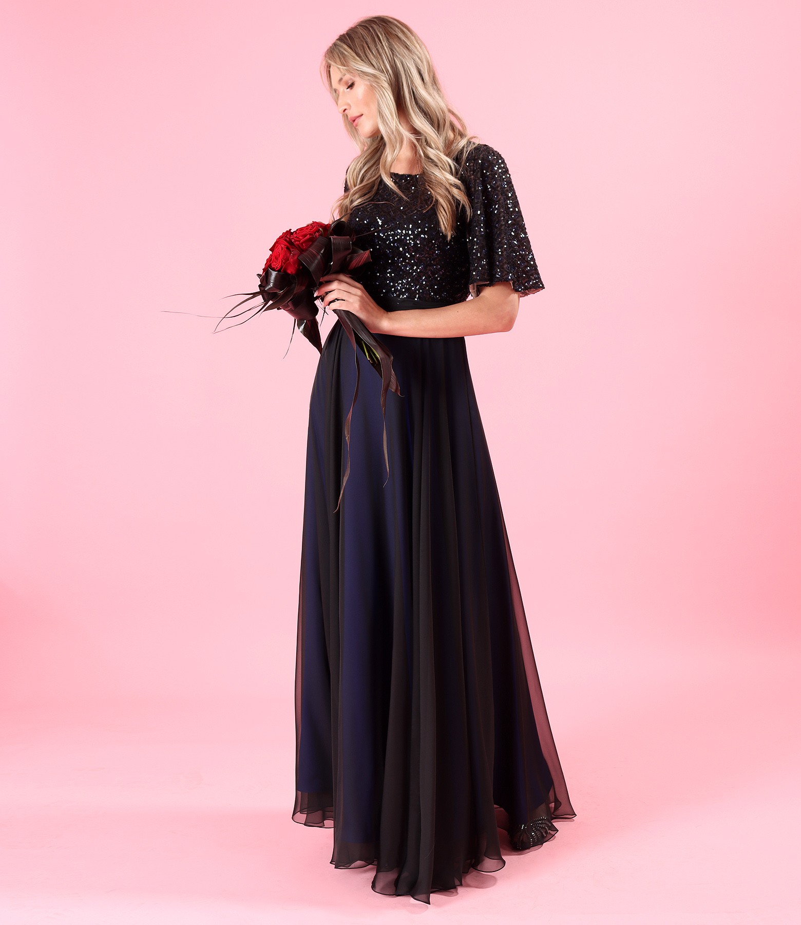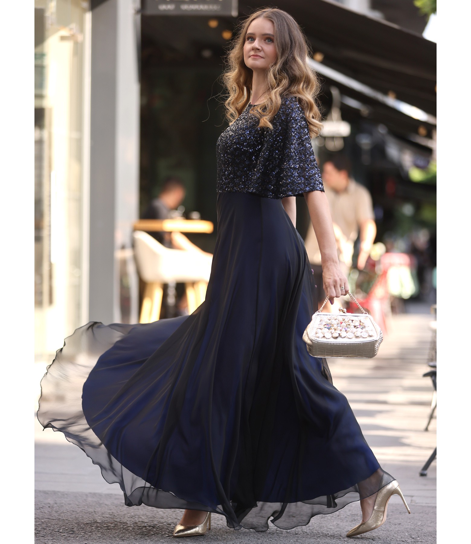 Elegant long veil dress with sequined bodice and sleeves (Dark blue), size