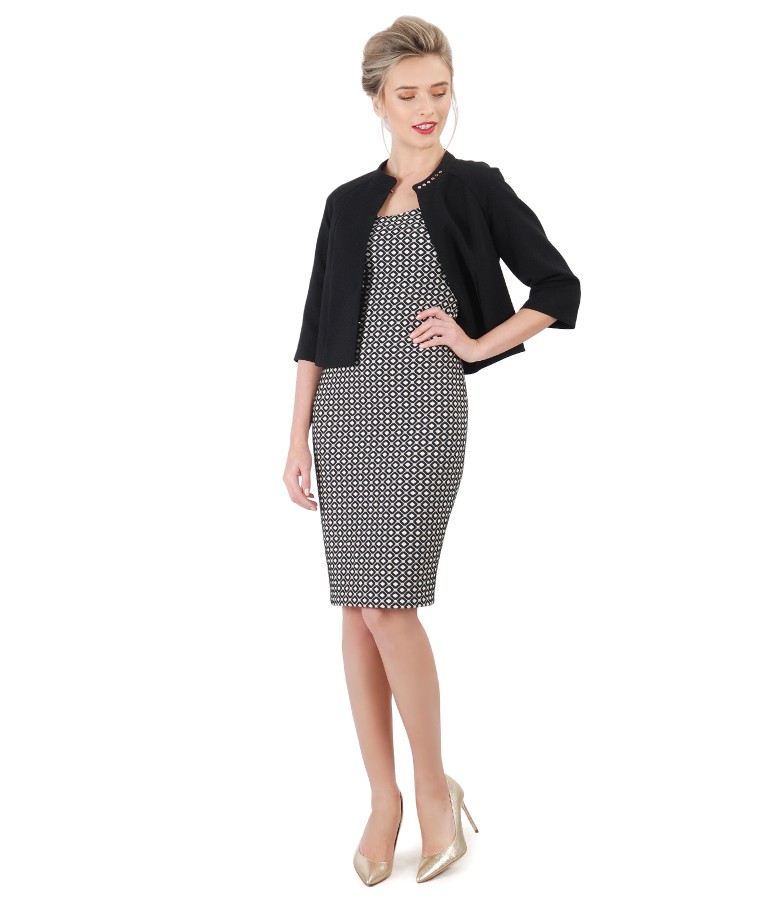 Elegant outfit with brocade cotton dress and bolero with crystals inserts on decolletage (), size
