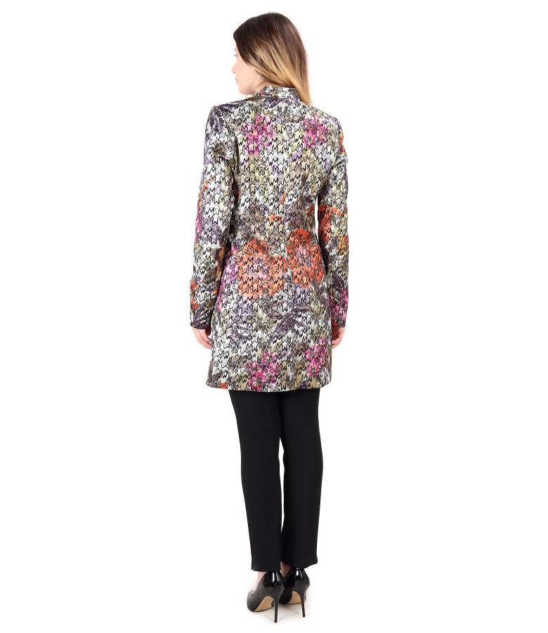 Elegant brocade jacket with metallic thread and woven with geometric motifs, padded, with tunic-like collar, with neckline around the neck and with two side pockets.