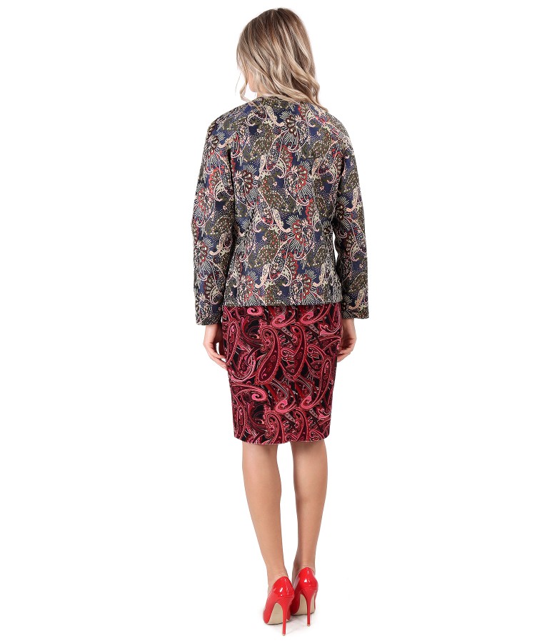 Elegant outfit with brocade jacket with velvet midi dress