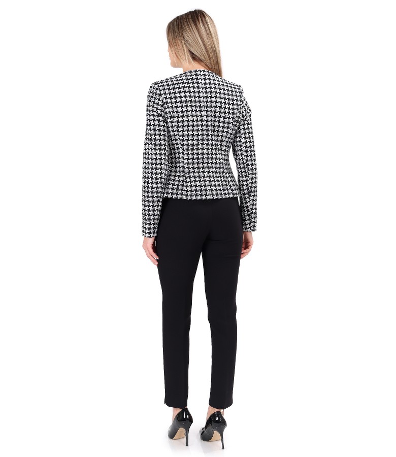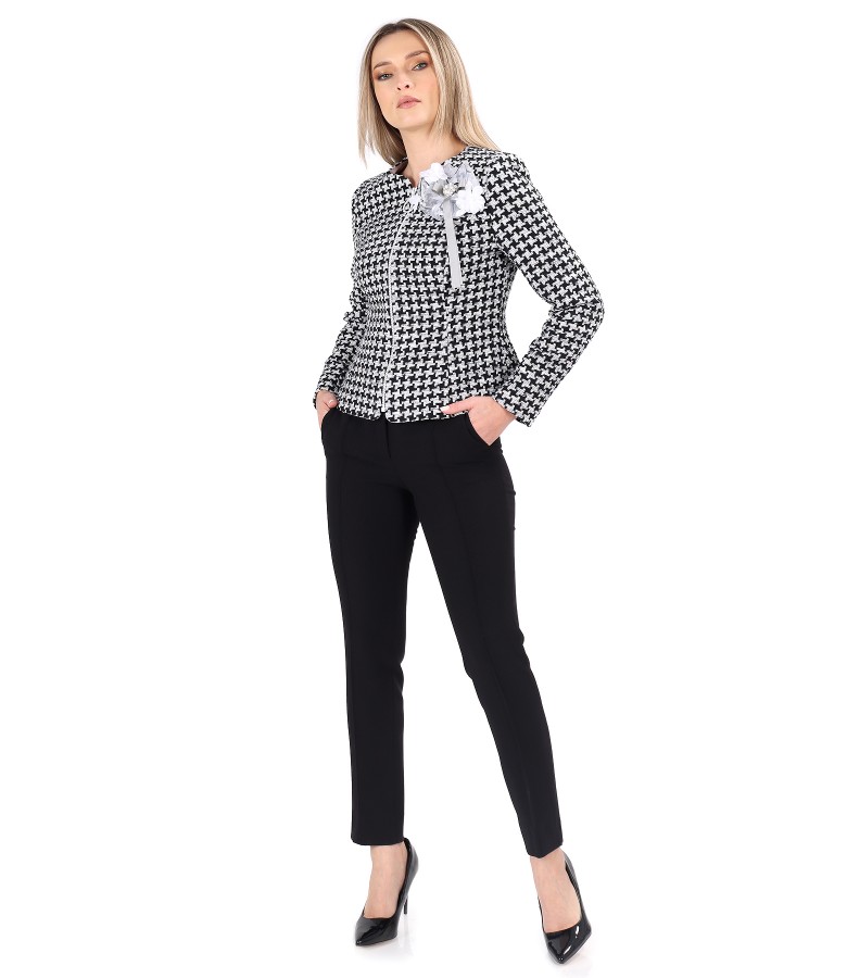 Multicolored cotton jacket, without collar, padded, with neckline next to the neck and with a detachable brooch, handmade, on the neckline.