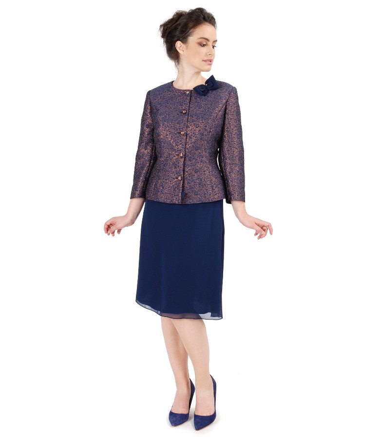 Elegant jacket made of brocade fabric with copper thread, padded, without collar and lapels with detachable veil bow.