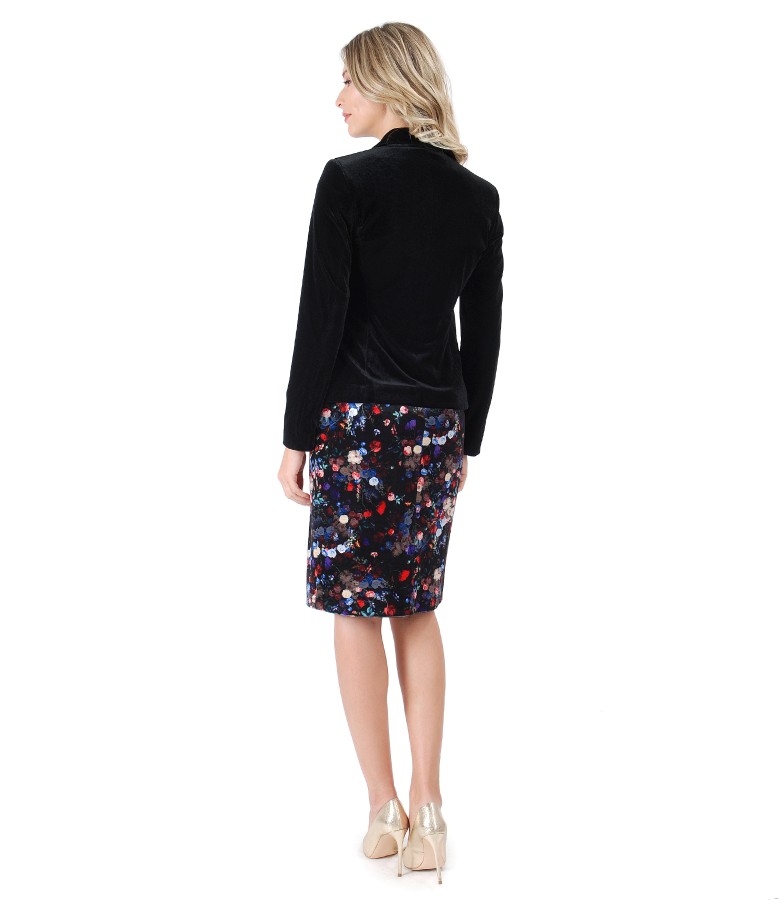 Midi velvet dress with floral motifs, oadded, with round low-cut neck and short sleeves.