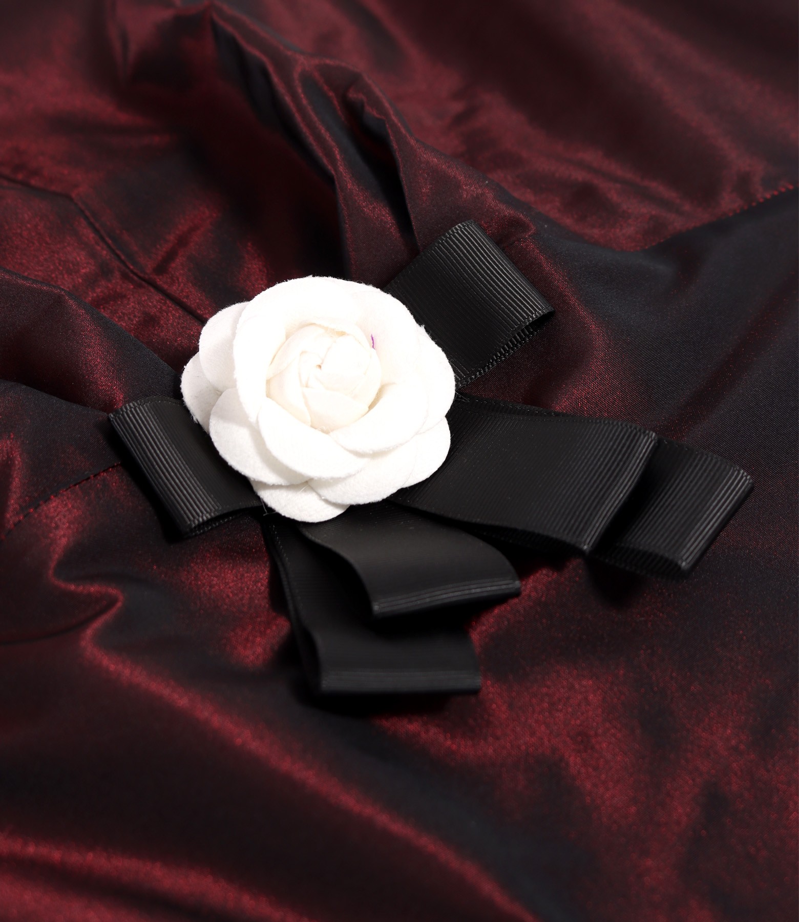 Elegant taffeta dress with a detachable flower-shaped brooch at the waist, doubled with viscose, sleeveless and with a round neckline. It closes with a hidden zipper at the center back.