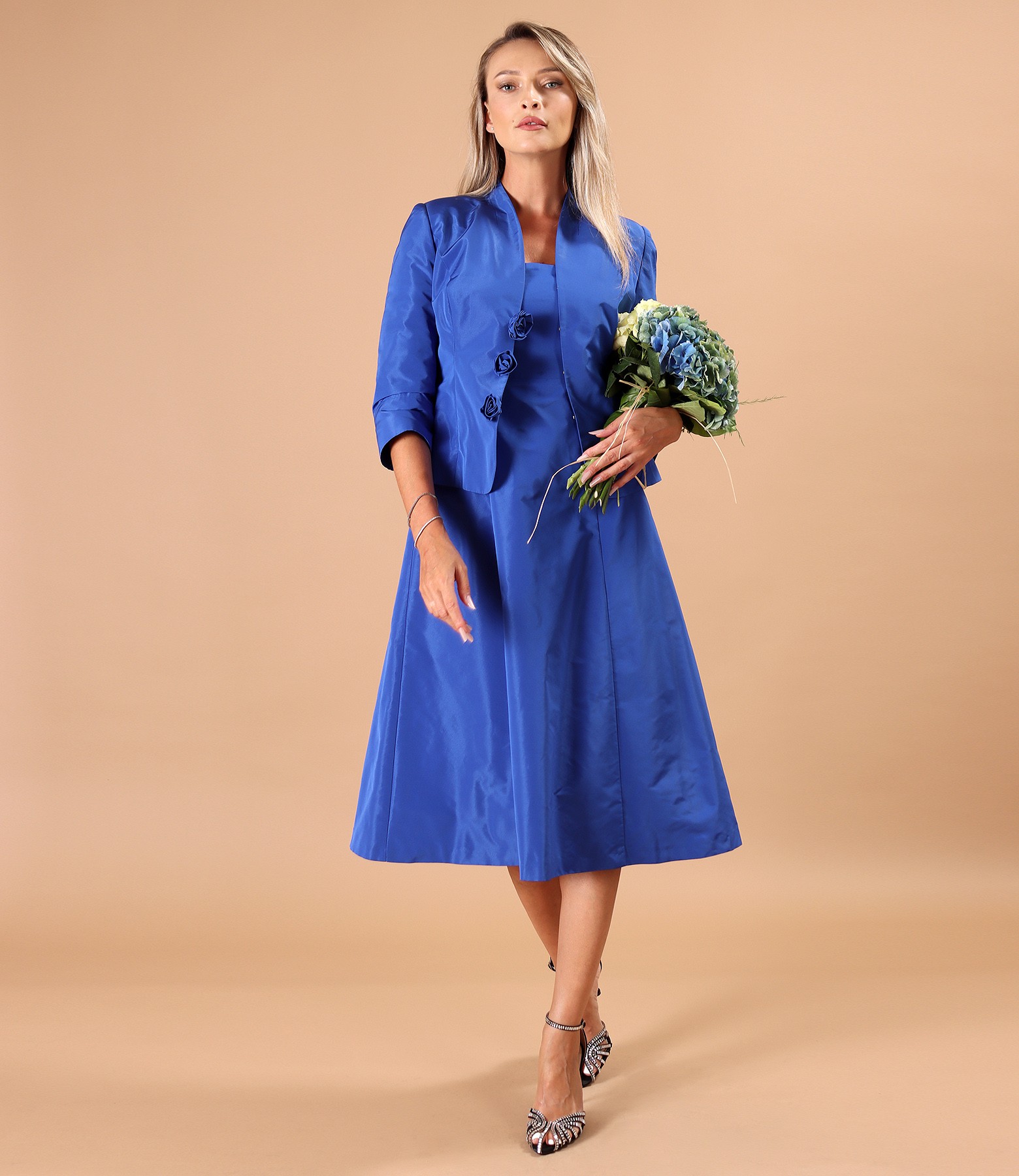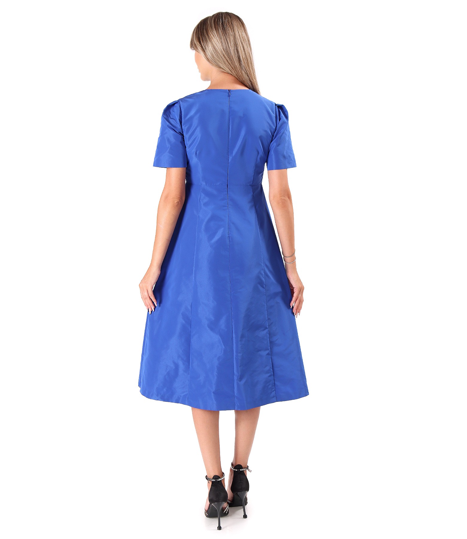 Flared taffeta dress with flower at the waist (Riyal blue), size