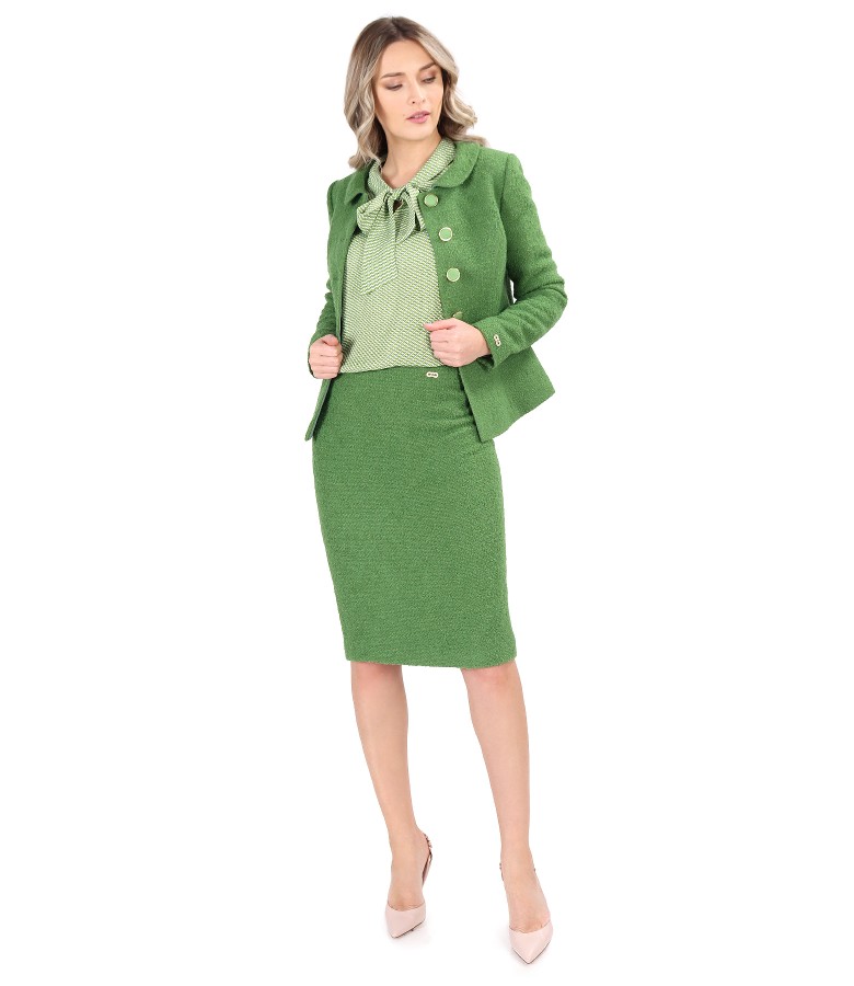 Jacket and skirt made of loops with viscose blouse and scarf collar