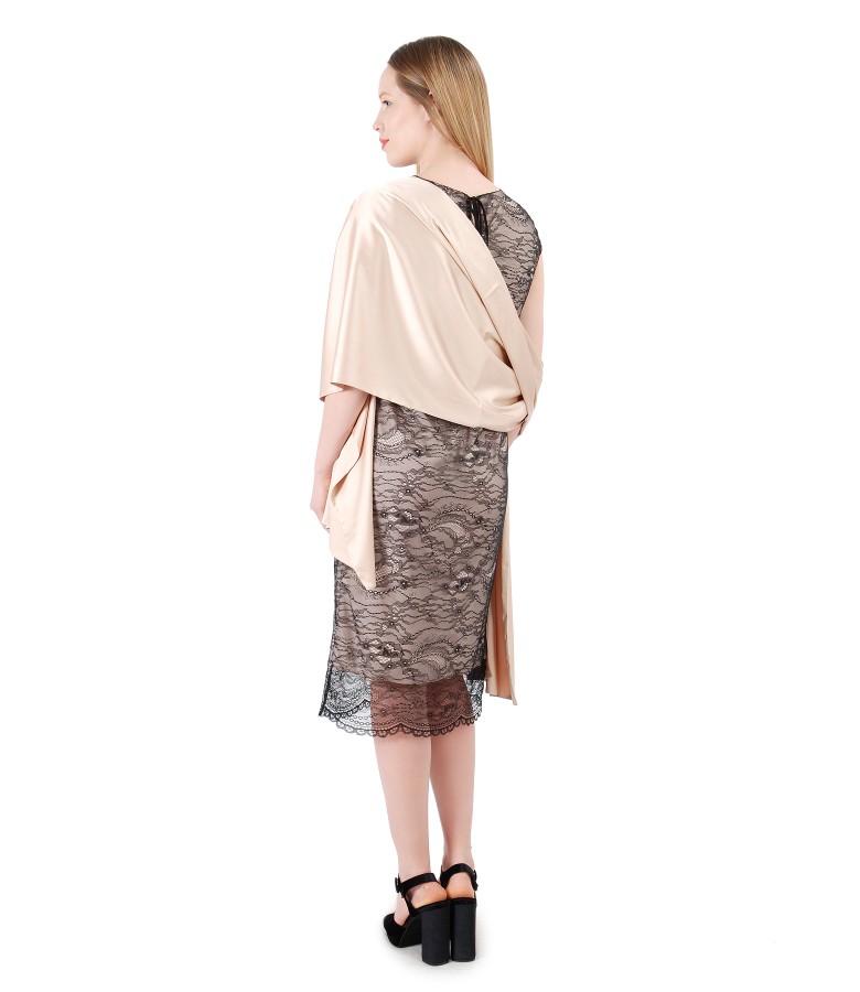 Midi dress made of lace with floral motifs, doubled with nude satin, with short sleeves.