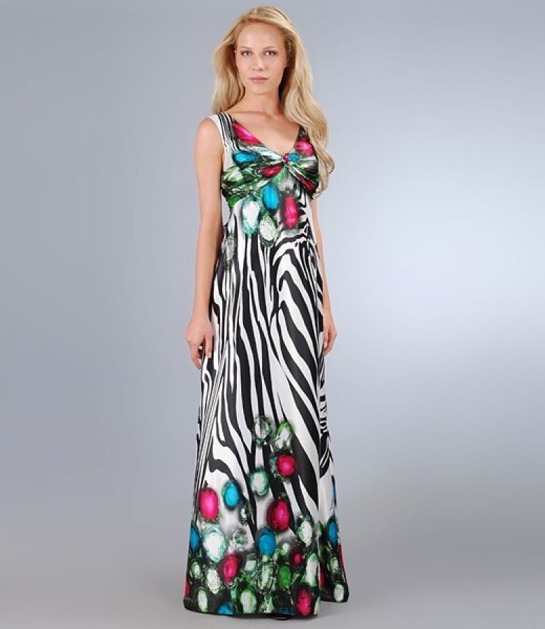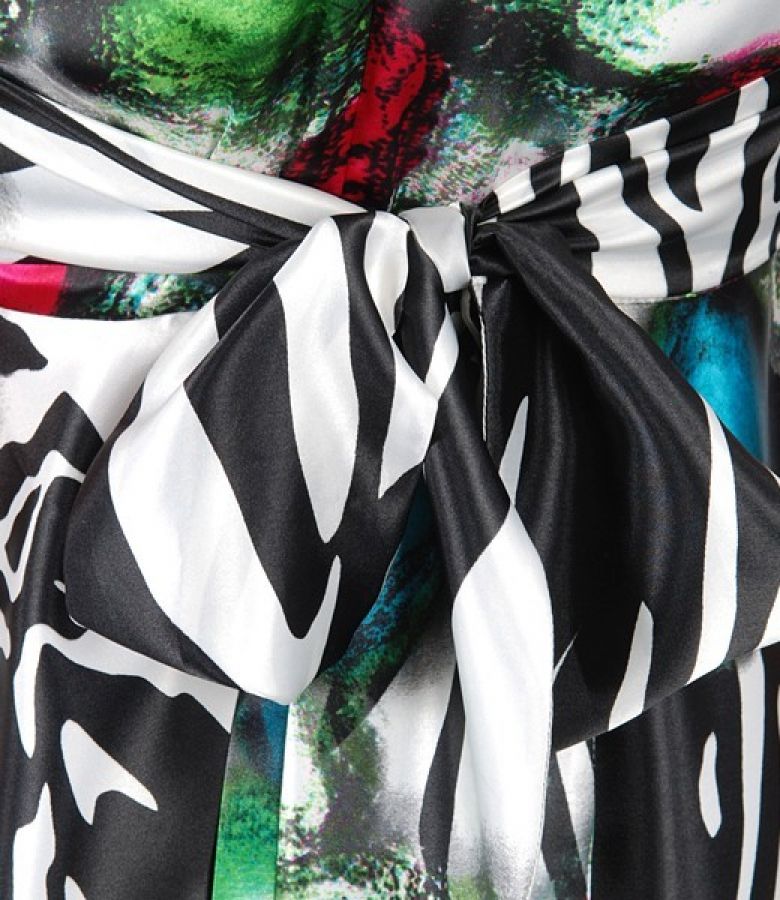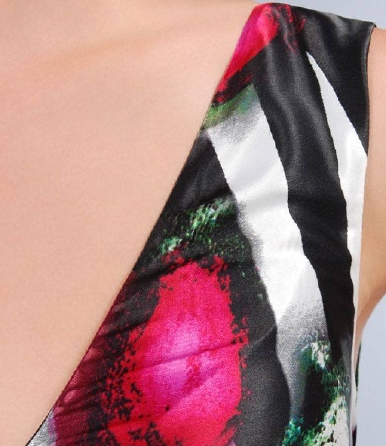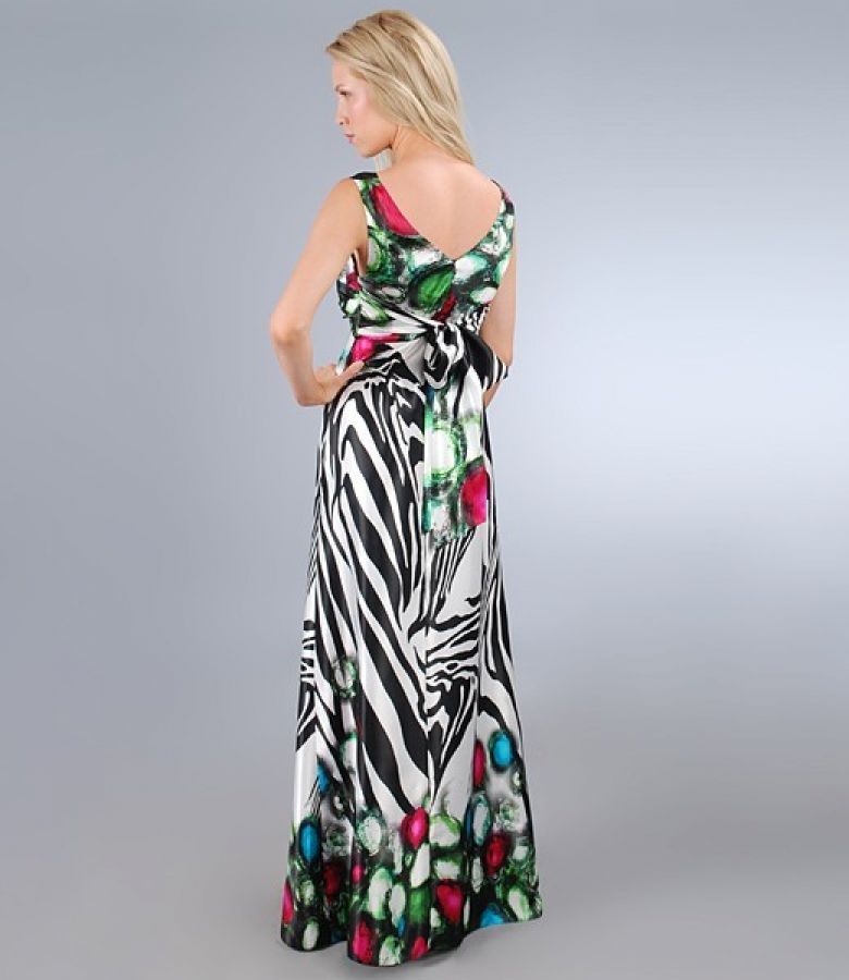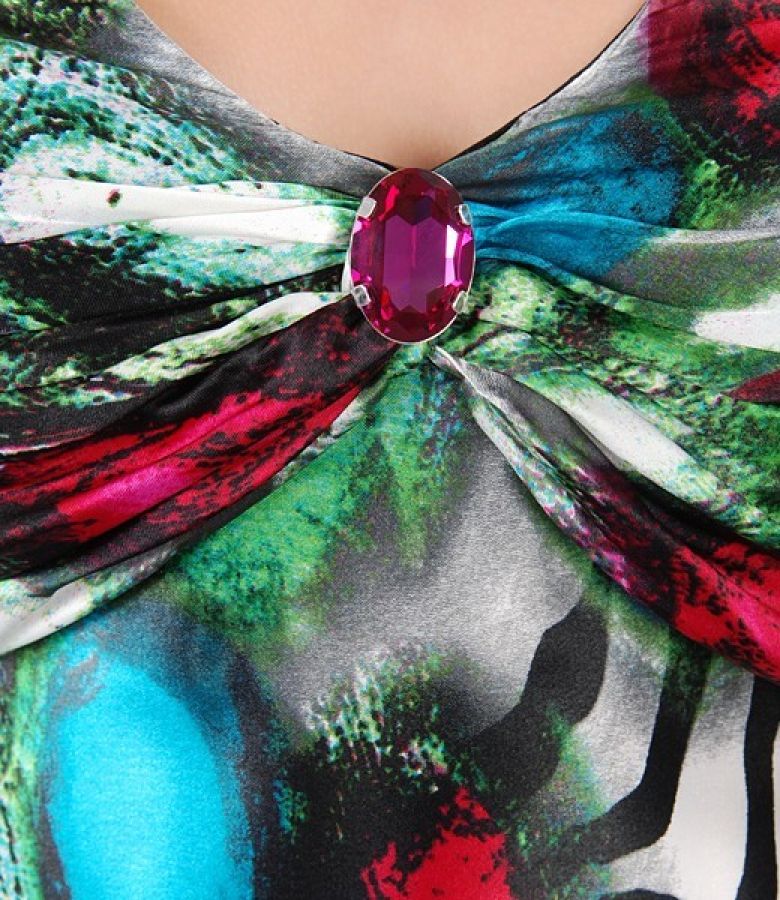 Long dress in print satin, corsage with knot,V neck-cut on back. Cut under bust, wide belt fixed on the side, close in bow on back. Crystal accessory fixed to bust. Mid back concealed zip fastening.