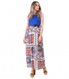 Long dress with printed viscose skirt, unlined, with the top made of plain elastic jersey, padded, without sleeves, and with decorative rips bow at the waist. Print position varies per product.