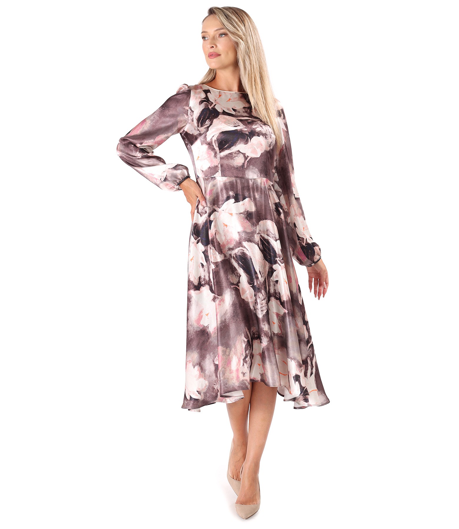Midi dress made of satin viscose printed with floral motifs, lined with viscose, featuring long sleeves gathered at the cuffs and a round neckline. Fastens with a concealed zipper at the back. The position of the print varies per product.