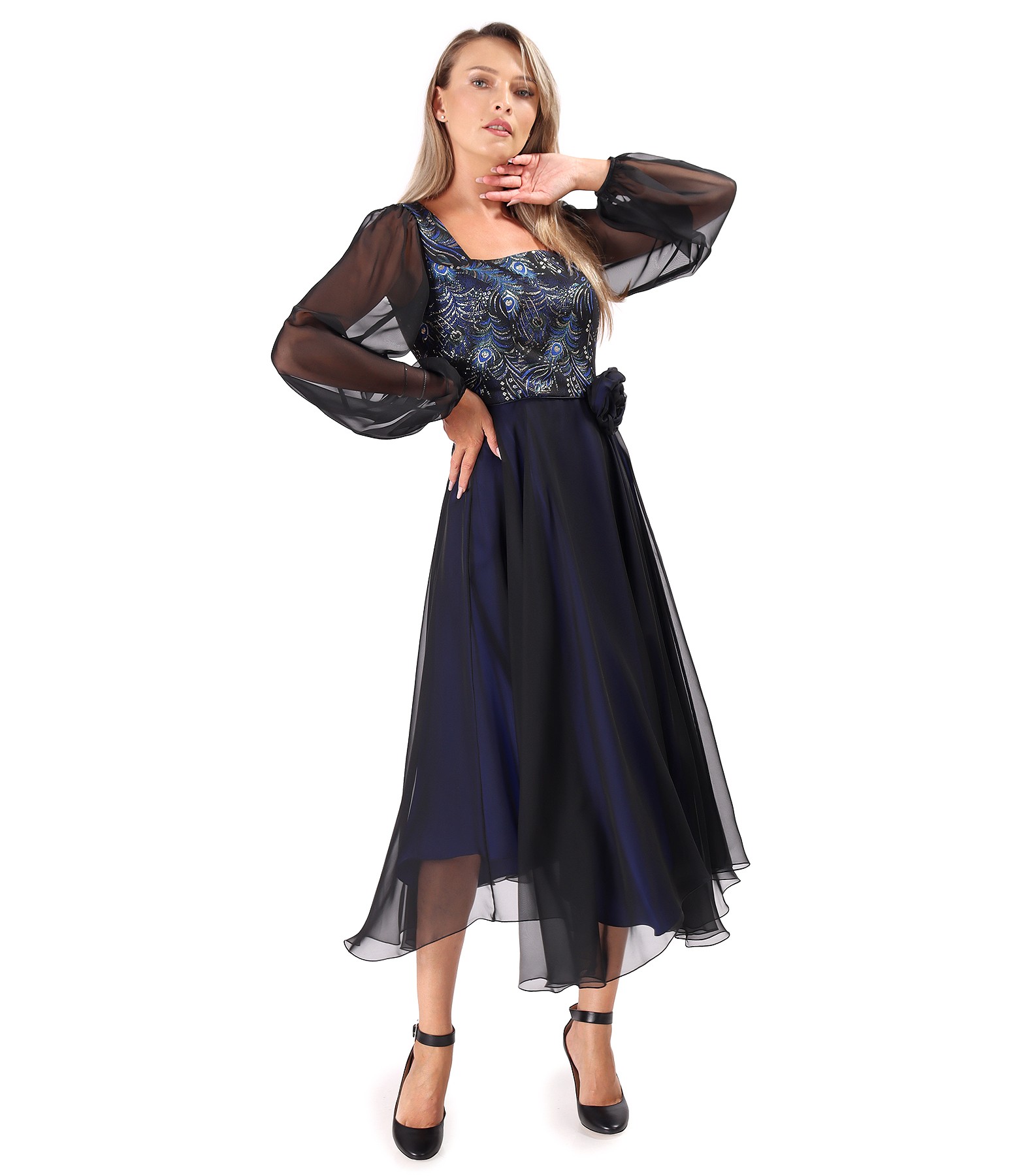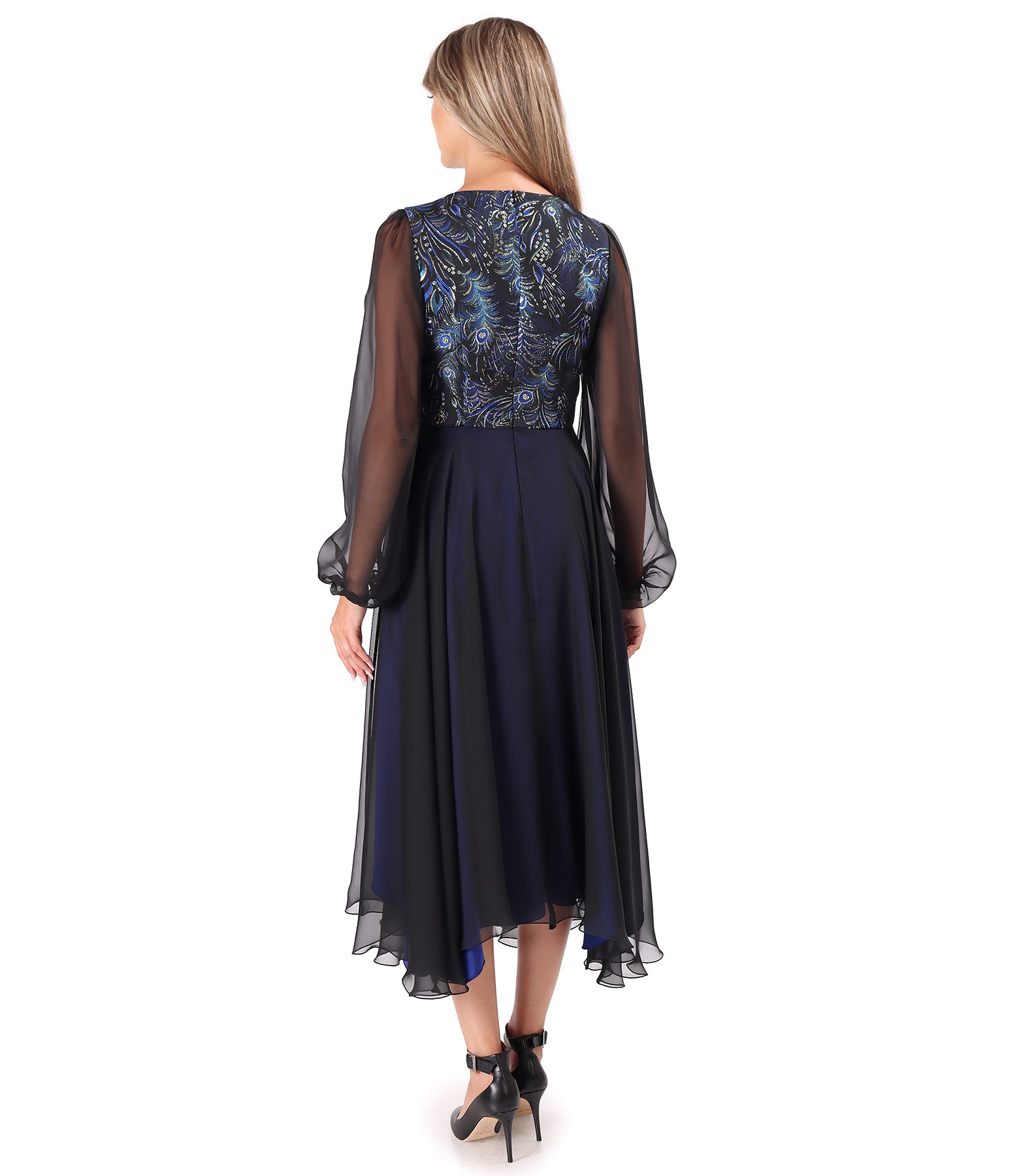 Midi evening dress with metallic brocade bodice, featuring floral motifs and long voile sleeves gathered at the cuffs. The dress is lined with contrasting elastic satin and includes a handmade detachable brooch. Fastens with a concealed zipper at the center back.