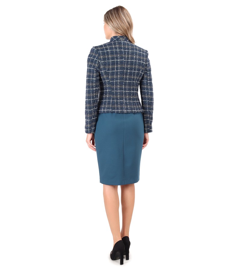 Elegant dress made of thick elastic jersey, unlined, with round decolletage, short sleeves, side pockets, and decorative application in the shape of a heart on the face.