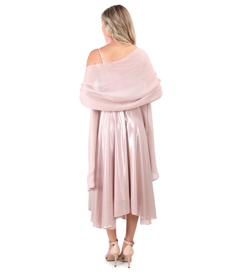 Occasion dress with a pearlescent veil skirt doubled with viscose and corset, with cups and adjustable straps and a bow at the waist.