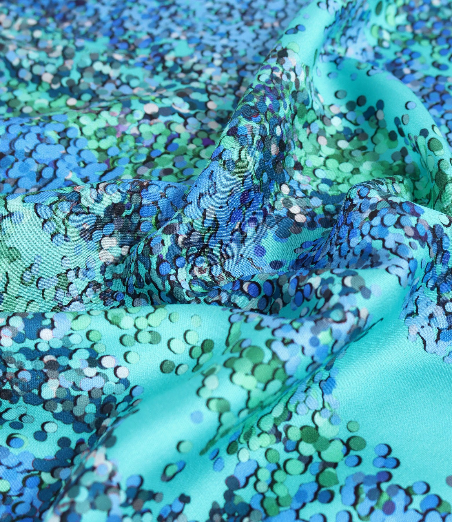 Printed viscose blouse, featuring long elasticated sleeves, a round neckline, and an elasticated hem at the waist. Fastens with a single button at the center front. The position of the print varies per product.