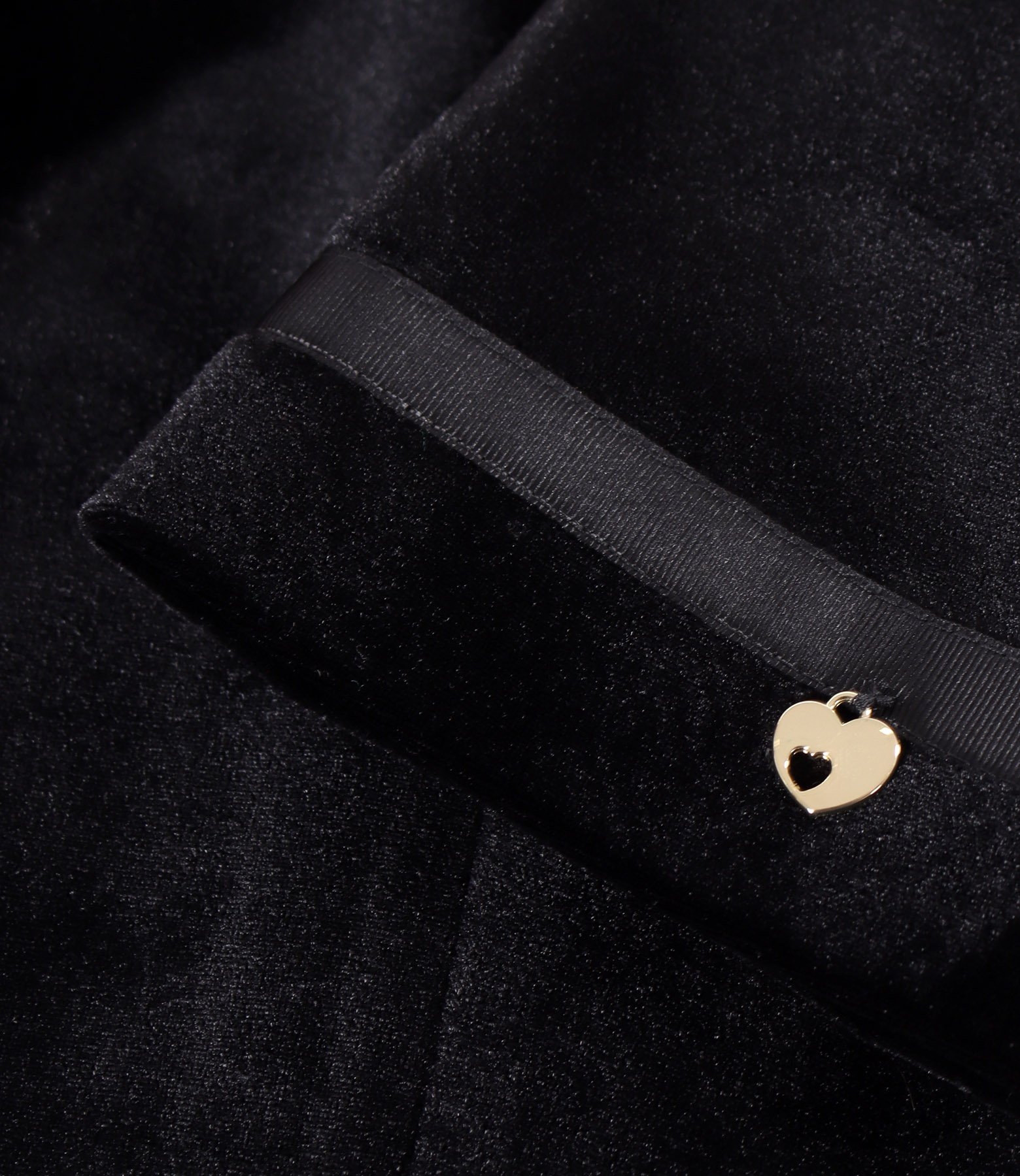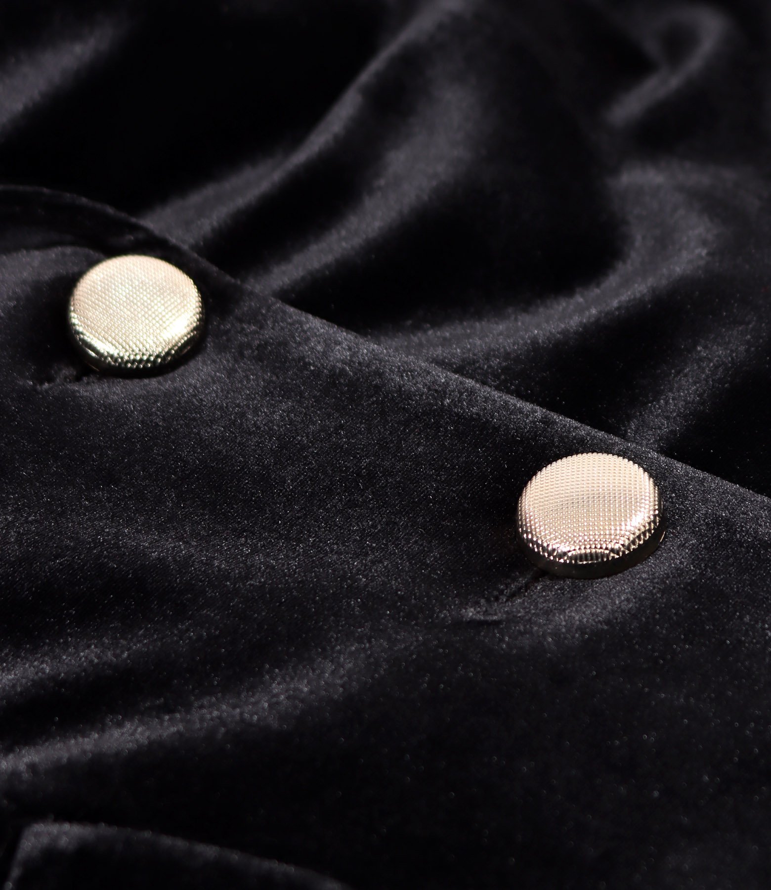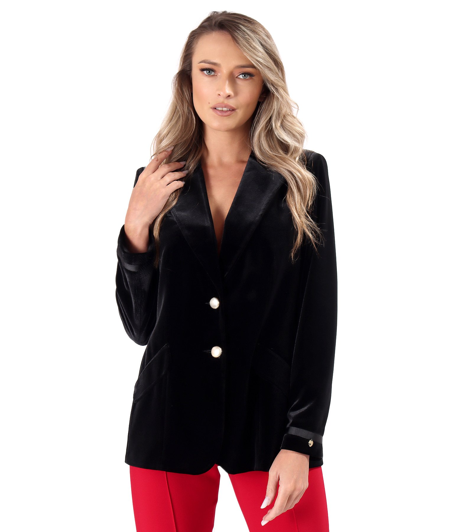Sacou office din catifea elastica neagra, captusit, cu decolteu adanc si cu doua clape decorative aplicate pe fata. Se inchide cu doi nasturi pe fata.