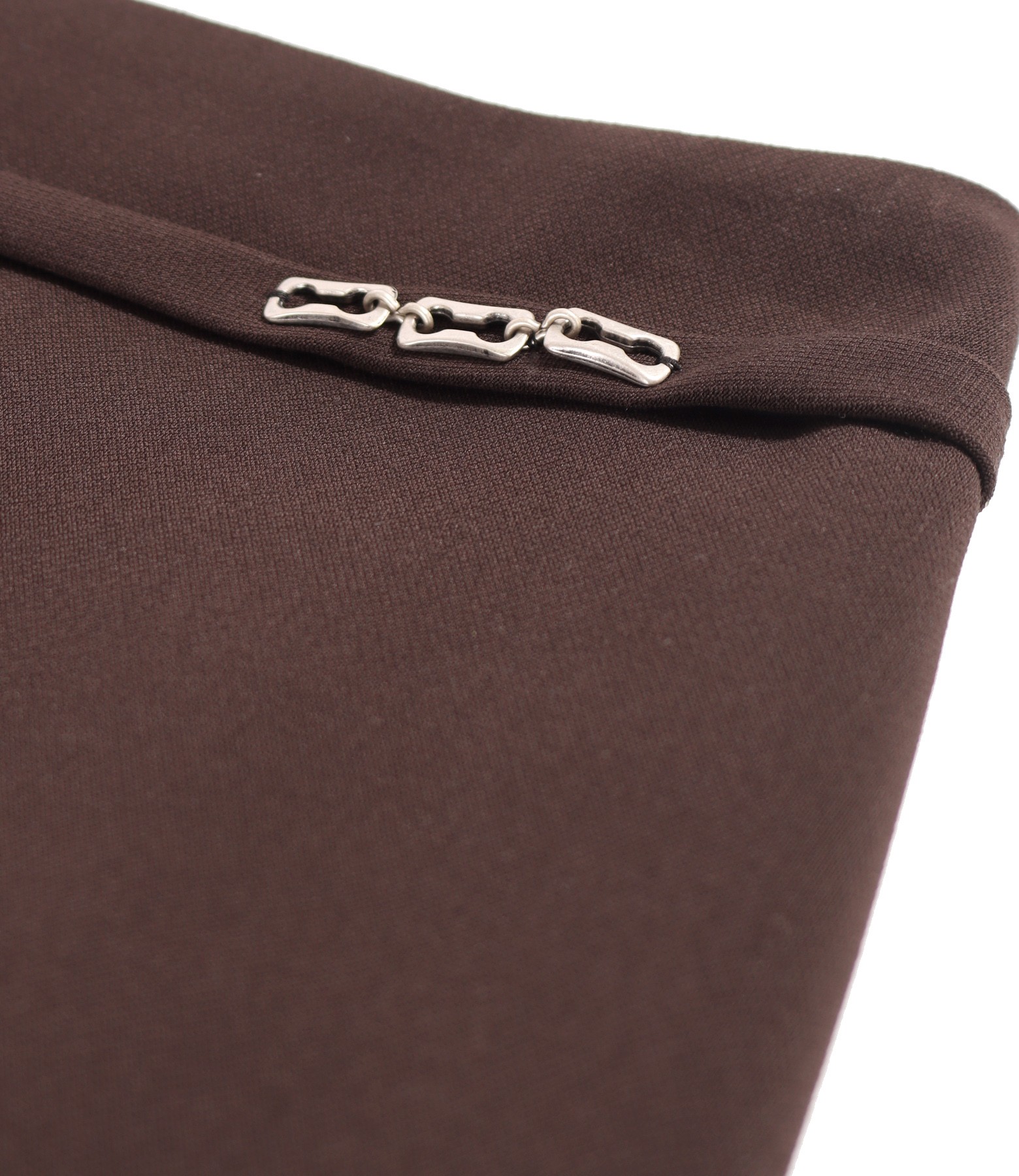 Short flared skirt made of elastic fabric with viscose, featuring a silver ornament at the waist. It fastens with a concealed zipper at the center back.