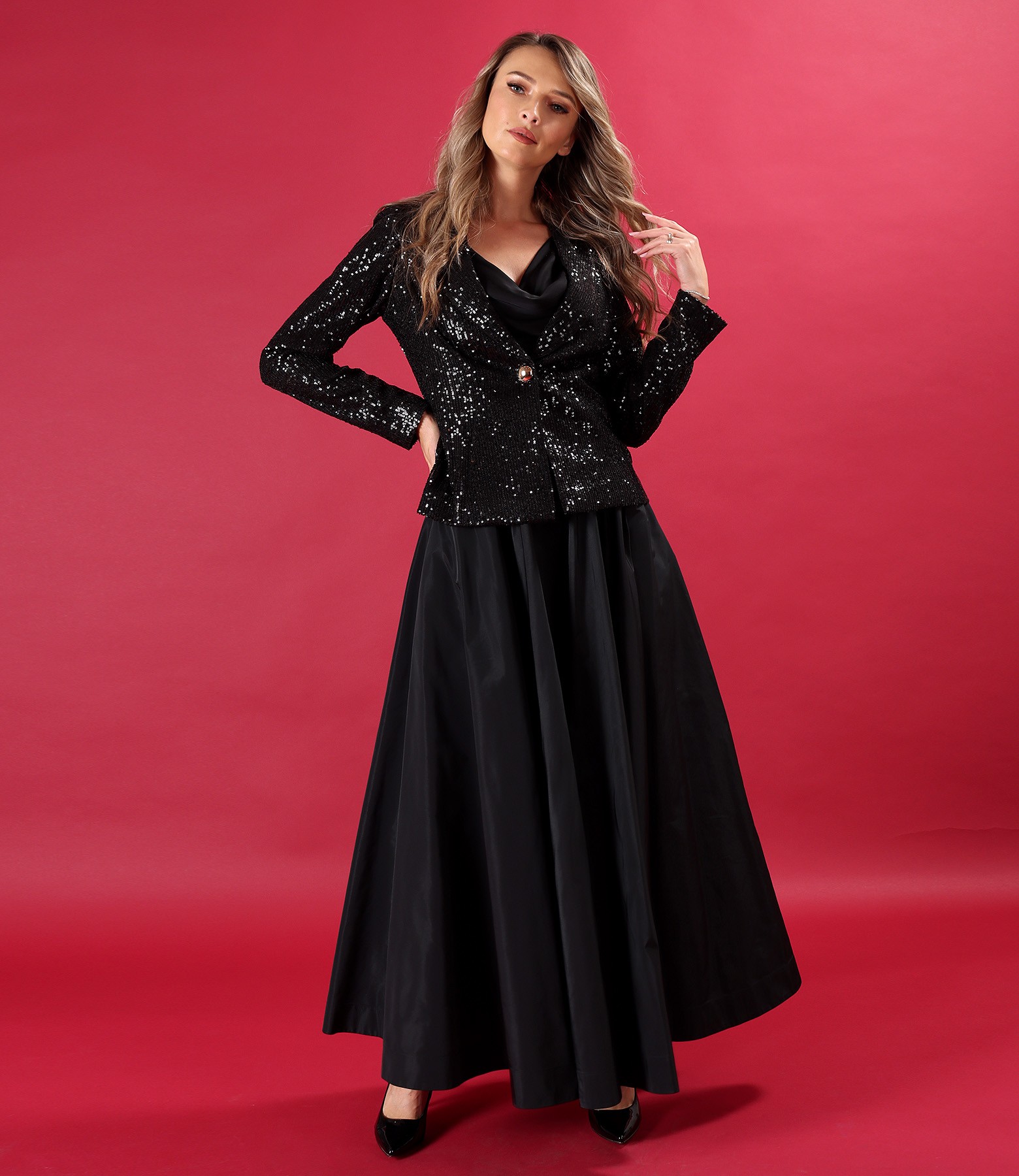 Tinuta de seara cu sacou din paiete si fusta lunga din tafta