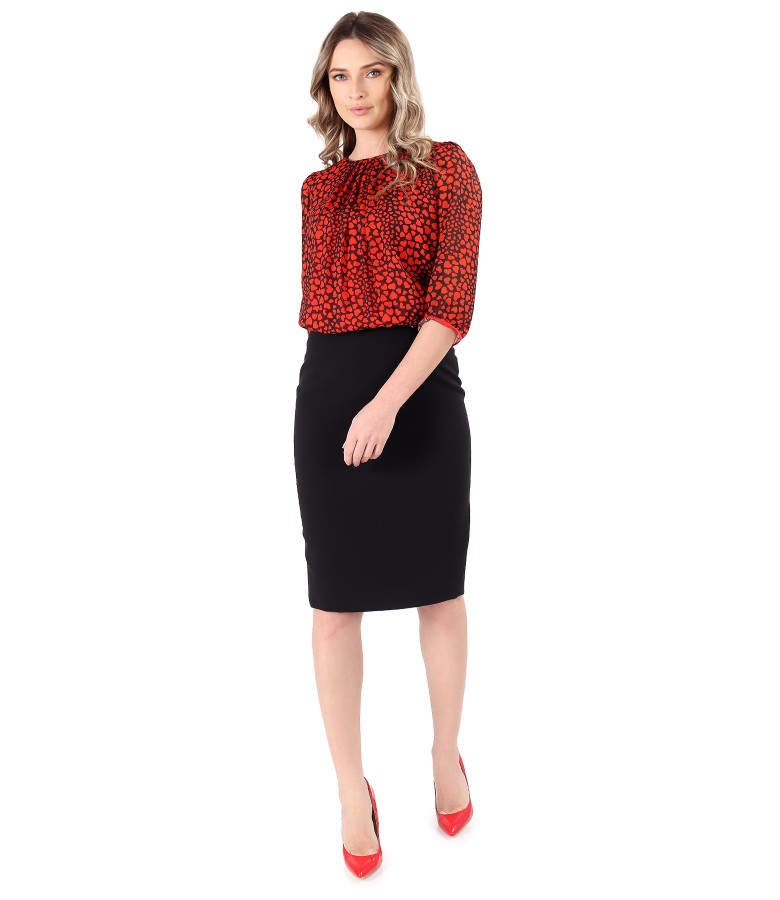 Elegant veil blouse printed with hearts, doubled with viscose, with 3/4 sleeves and round neckline.