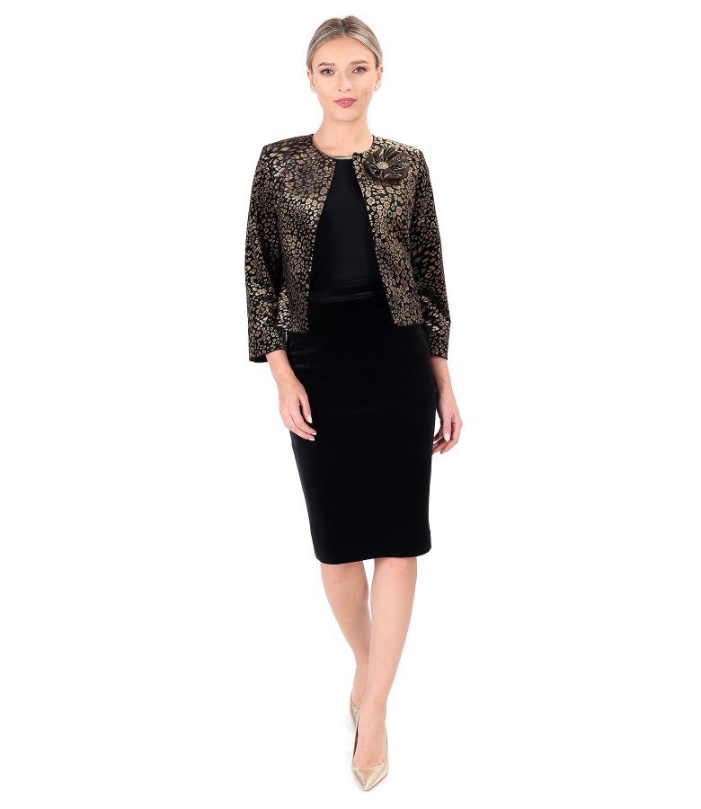 Velvet bolero printed with golden motifs with black velvet tapered skirt